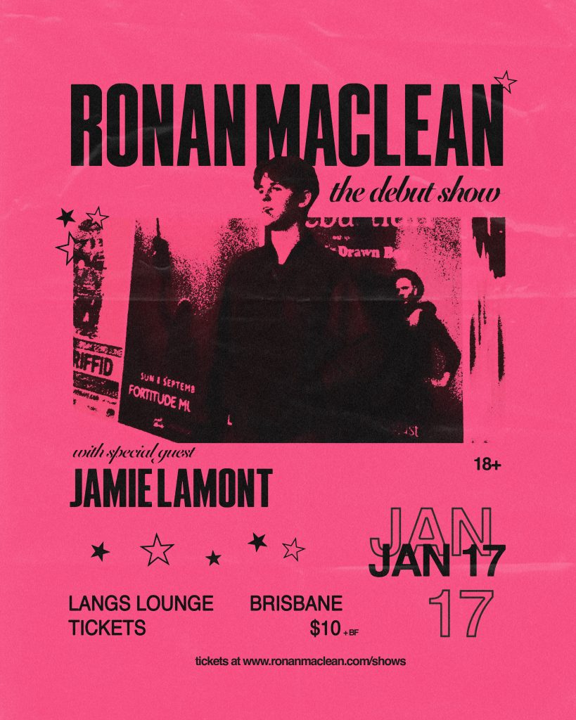 Shows Shows Ronan Maclean - the debut show @Langs Lounge Hear Ronan Maclean’s greatest hits live for the first time at Langs Lounge in Brisbane. Featuring special guest opener Jamie Lamont. RONAN MACLEAN ANNOUNCES DEBUT EP ‘THE MANIAC EP,’ Lead single “I HOPE U NEVER KNOW HER” OUT NOW! LISTEN HERE